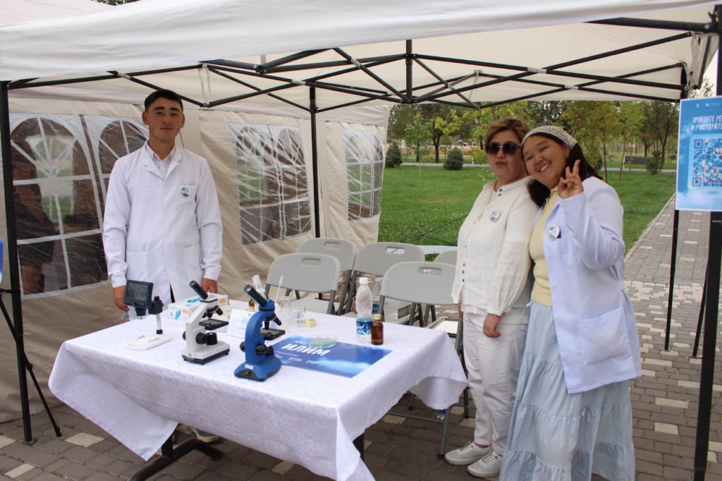 Science Space (“Ilim”) offered hands-on experiments. At “Taza Aba” (“Clean Air”) visitors assembled simple air purifiers and compared air quality inside and outside the tent. At “Öpkö Süyloyt” (“The Lungs Speak”) a pulmonologist checked participants’ breathing and explained the health impacts of pollution. At “Toluk Dem” (“Full Breath”) guests measured lung capacity, while “Zhashyldan” (“Go Green”) showcased green school facades, algae-based air cleaning, and a crowdfunding initiative — “1000 Green Walls.” At “Eco Muun” participants examined PM particles under a microscope, comparing their size to a human hair.